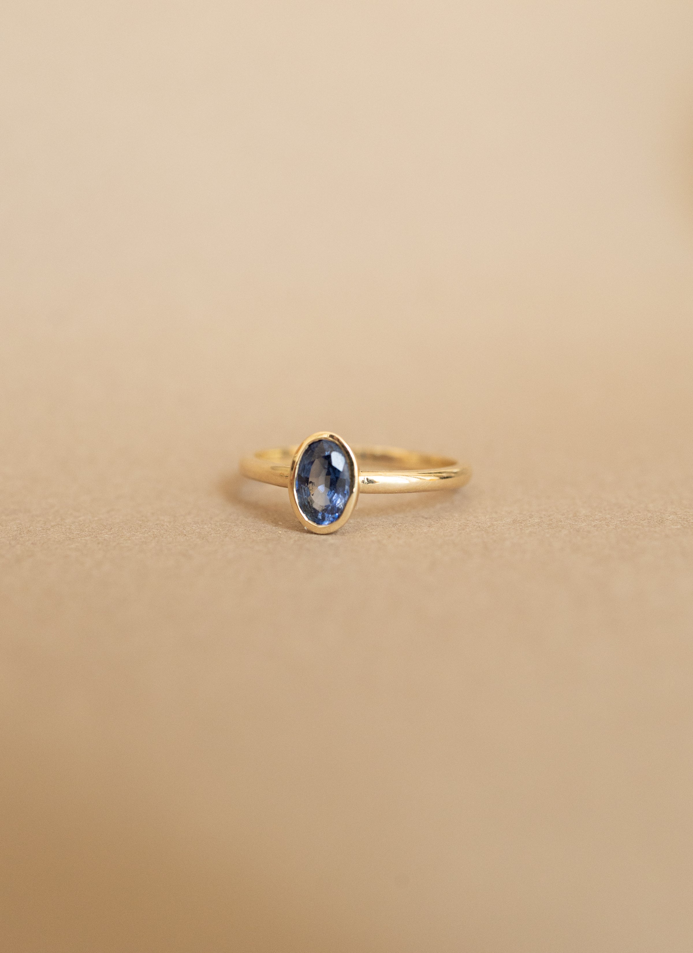 Anillo zafiro azul OV 0.7ct bisel 14k