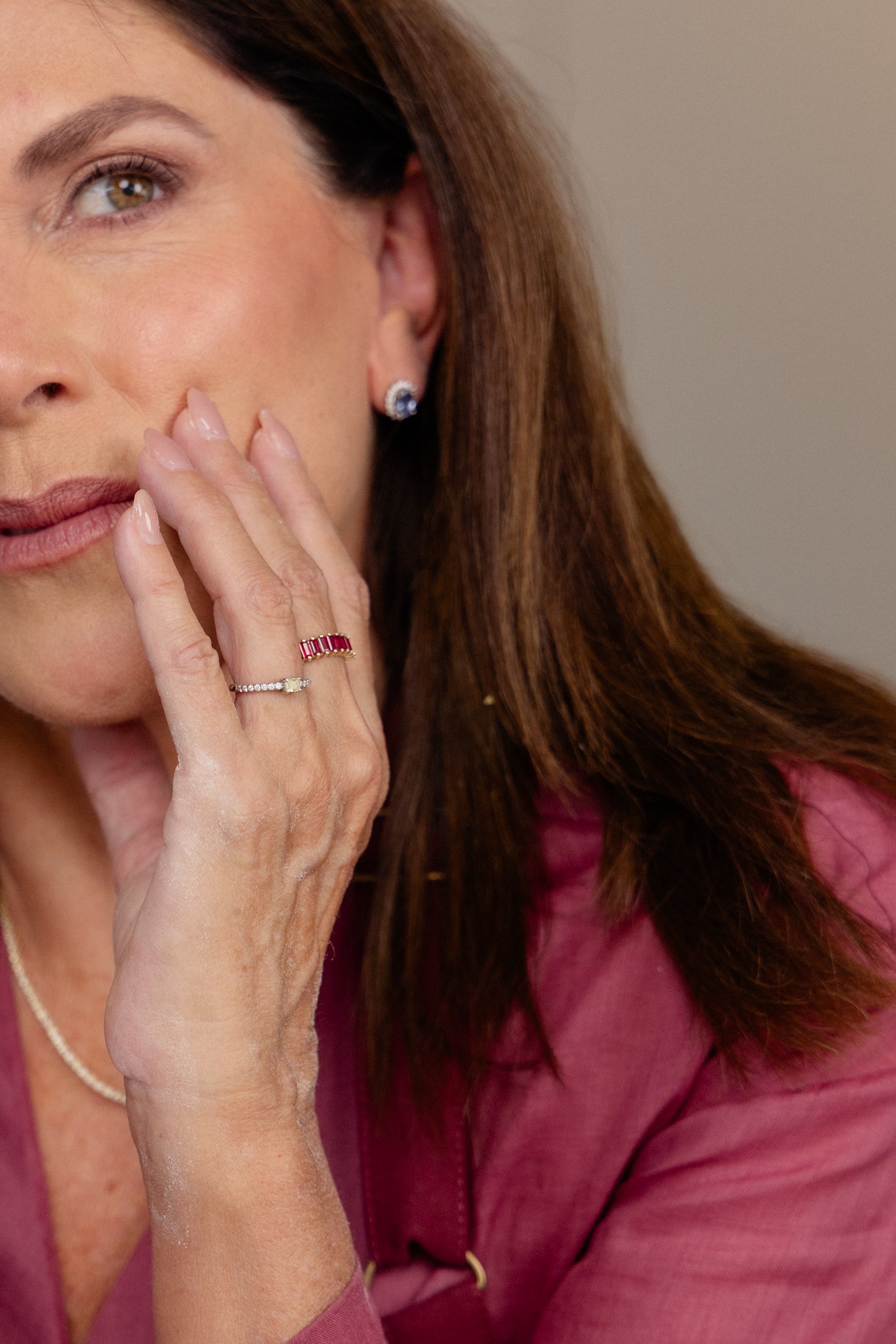 Aretes Kate en oro de 14K con zafiros azules de 2 ct en total, enmarcados por un halo de diamantes que suma 0.5 ct. Un diseño clásico y atemporal que resalta la intensidad del zafiro con el brillo delicado de los diamantes, creando una joya elegante y poderosa para ocasiones especiales o para elevar cualquier look.